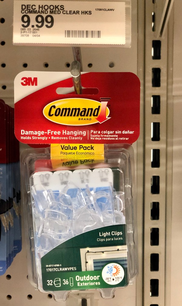 Next was finding something durable & simple to keep the lights up. For years I watched my dad attach lights to our roof with those little plastic clips & I decided I wanted no part of that (ladders, no thank you)! I went to the Command hook aisle hoping to find something easy to use & they actually make light clips specifically made for outdoor use. WHO KNEW?! The Command Clear Outdoor Light Clips are only $9.99 for 36 (the clips are reusable–just buy new sticky strips).